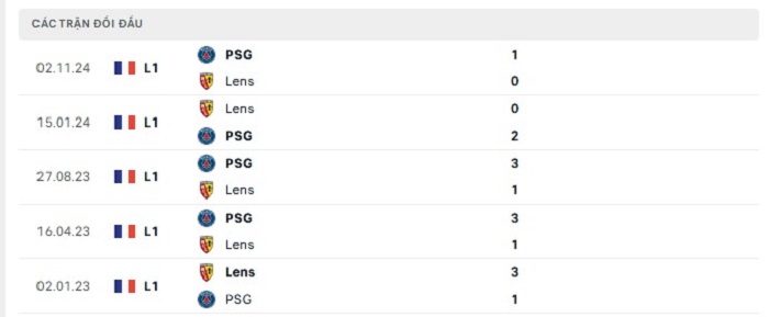 Lịch sử đối đầu của Lens vs Paris Saint-Germain