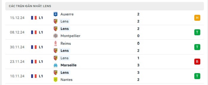 Phong độ gần đây Lens vs Paris Saint-Germain