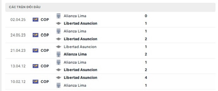 Lịch sử đối đầu của Libertad vs Alianza Lima