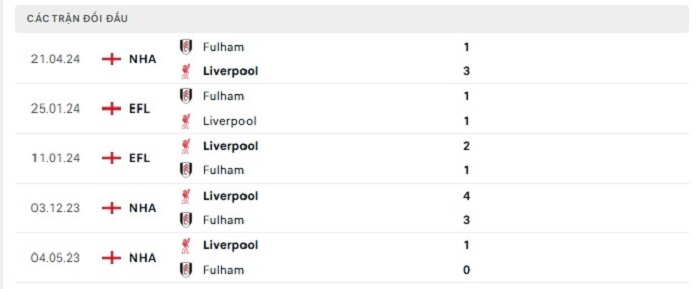 Phong độ gần đây Liverpool vs Fulham