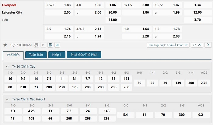 - Dự đoán tỉ số trận đấuLiverpool vs Leicester City