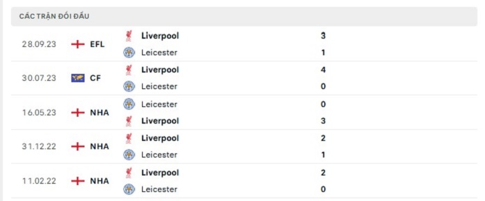 Bảng bóng đá trận đấu Liverpool vs Leicester City