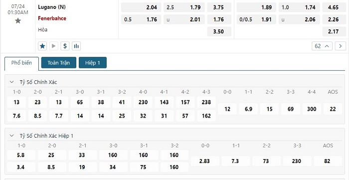 Bảng tỷ lệ kèo bóng đá trận đấu Lugano vs Fenerbahce