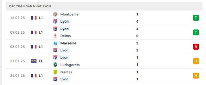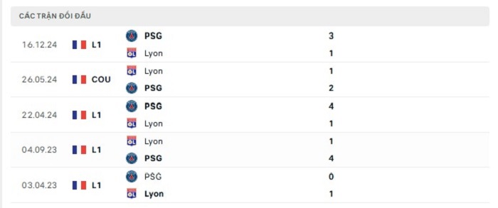 Phong độ gần đây Lyon vs Paris Saint-Germain
