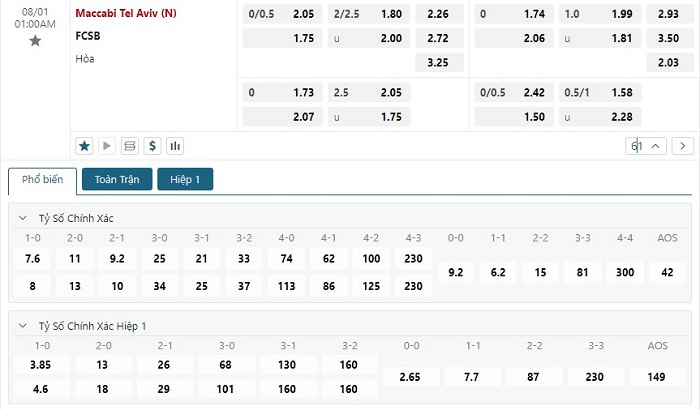 Bảng tỷ lệ kèo bóng đá trận đấu Maccabi Tel Aviv vs Steaua Bucuresti