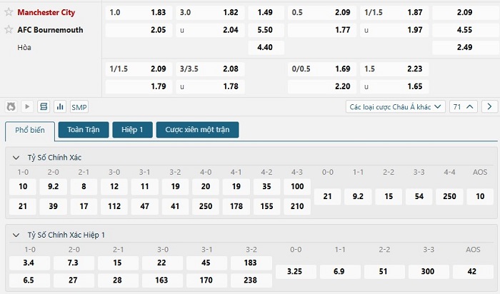 Bảng tỷ lệ kèo bóng đá trận đấu Manchester City vs Bournemouth