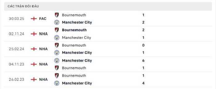 Lịch sử đối đầu của Manchester City vs Bournemouth