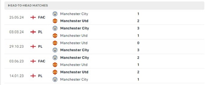 Phong độ gần đây Manchester City vs Manchester United
