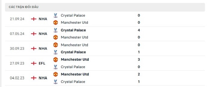 Lịch sử đối đầu của Manchester United vs Crystal Palace