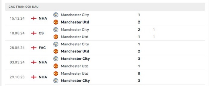 Phong độ gần đây Manchester United vs Manchester City