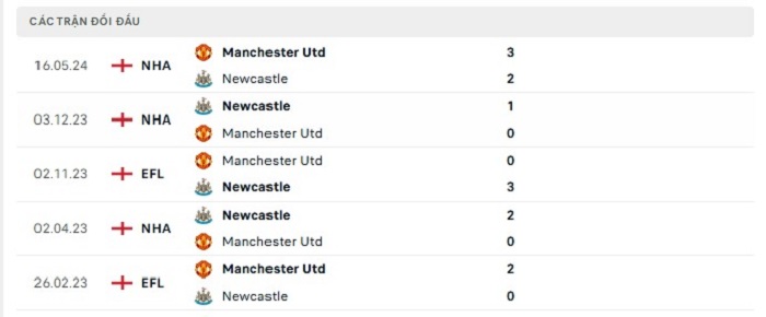 Bảng bóng đá trận đấu Manchester United vs Newcastle
