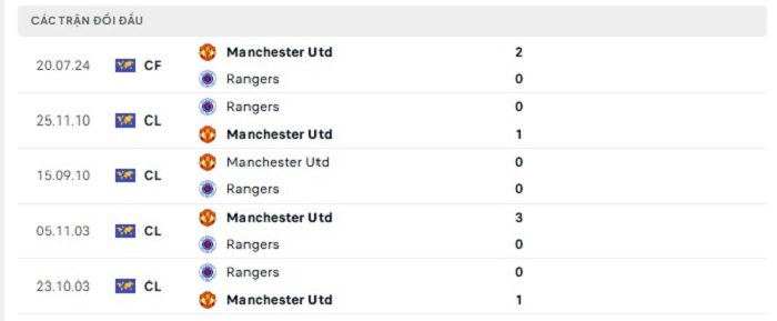Bảng  bóng đá trận đấu Manchester United vs Rangers