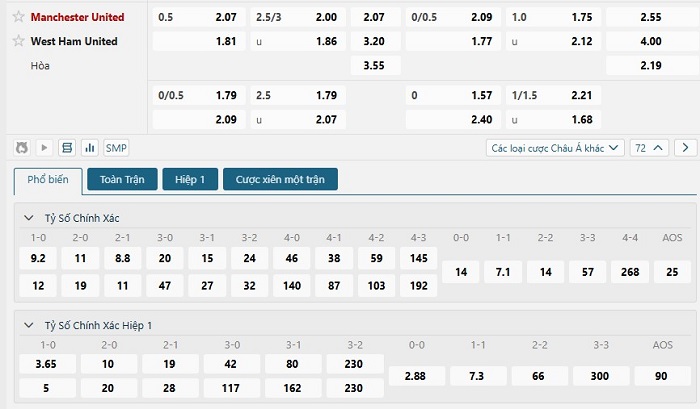 Bảng tỷ lệ kèo bóng đá trận đấu Manchester United vs West Ham