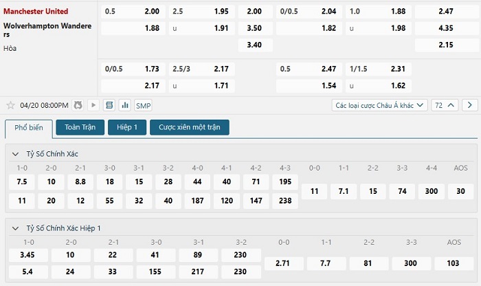 Bảng tỷ lệ kèo bóng đá trận đấu Manchester United vs Wolverhampton