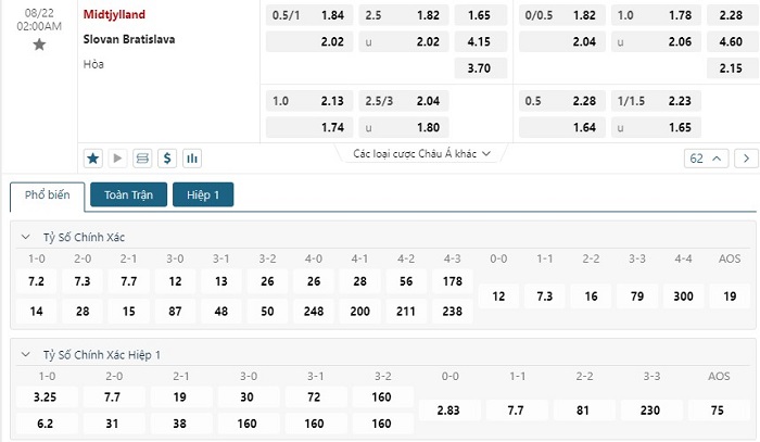 Bảng tỷ lệ kèo bóng đá trận đấu Midtjylland vs Slovan Bratislava