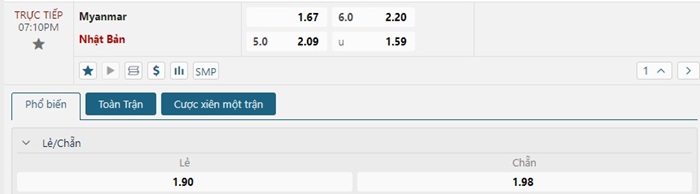 Bảng tỷ lệ kèo bóng đá trận đấu Myanmar vs Nhật Bản