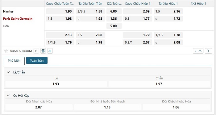 Bảng tỷ lệ kèo bóng đá trận đấu Nantes vs Paris Saint Germain