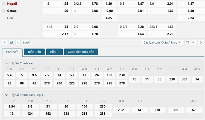 Bảng tỷ lệ kèo bóng đá trận đấu Napoli vs Genoa
