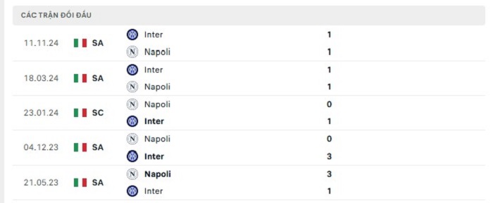 Phong độ gần đây Napoli vs Inter Milan
