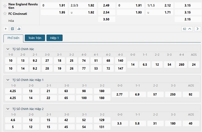 Bảng tỷ lệ kèo bóng đá trận đấu New England Revolution vs FC Cincinnati