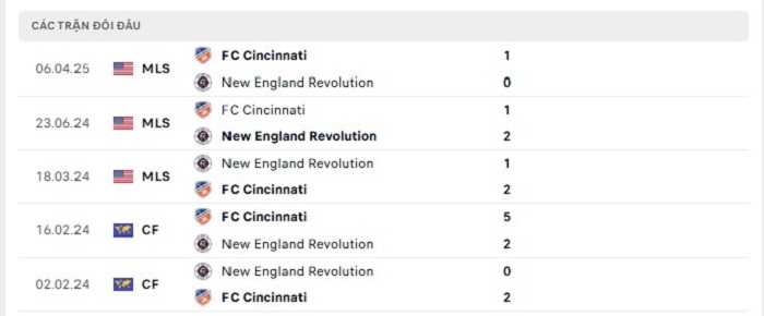 Lịch sử đối đầu của New England Revolution vs FC Cincinnati