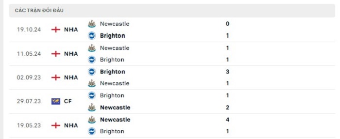 Bảng bóng đá trận đấu Newcastle United vs Brighton