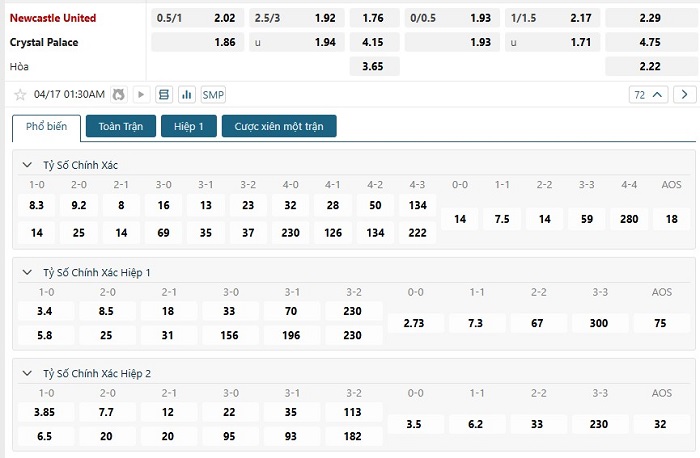Bảng tỷ lệ kèo bóng đá trận đấu Newcastle vs Crystal Palace