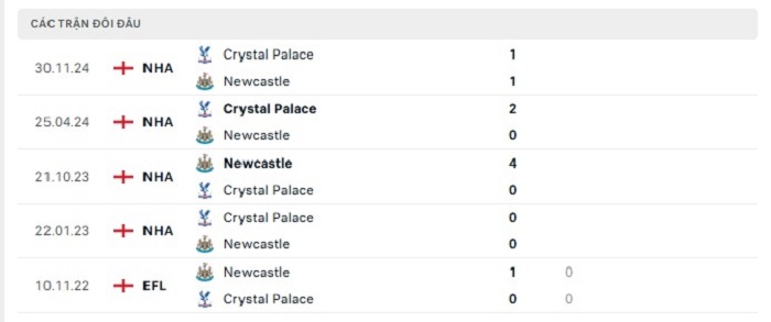 Phong độ gần đây Newcastle vs Crystal Palace