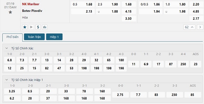 Bảng tỷ lệ kèo bóng đá trận đấu NK Maribor vs Botev Plovdiv