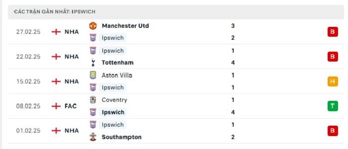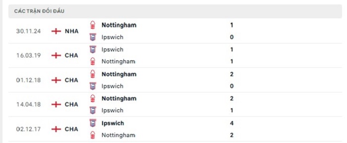 Lịch sử đối đầu của Nottingham vs Ipswich