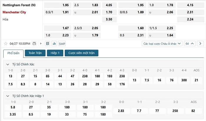 Bảng tỷ lệ kèo bóng đá trận đấu Nottingham vs Manchester City