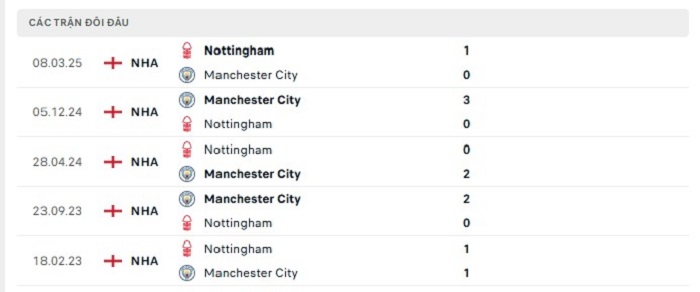 Lịch sử đối đầu của Nottingham vs Manchester City