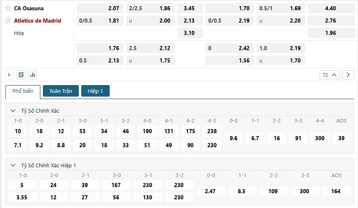 Bảng tỷ lệ kèo bóng đá trận đấu Osasuna vs Atletico Madrid