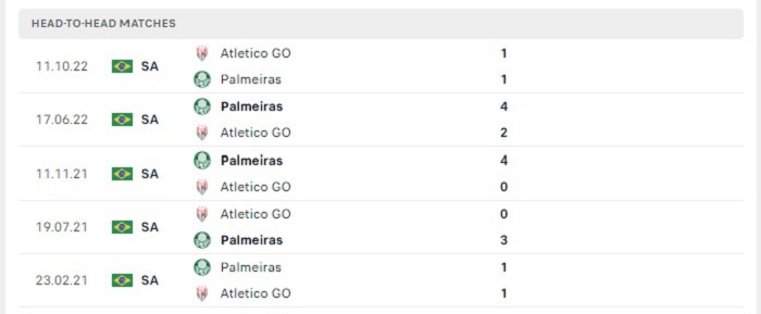 Lịch sử đối đầu của Palmeiras vs Atletico Clube Goianiense