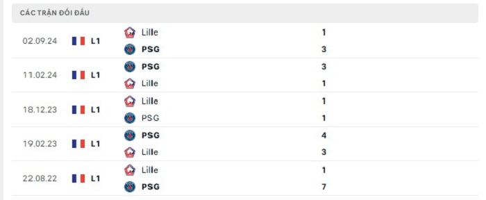 Bảng bóng đá trận đấu Paris Saint Germain vs Lille