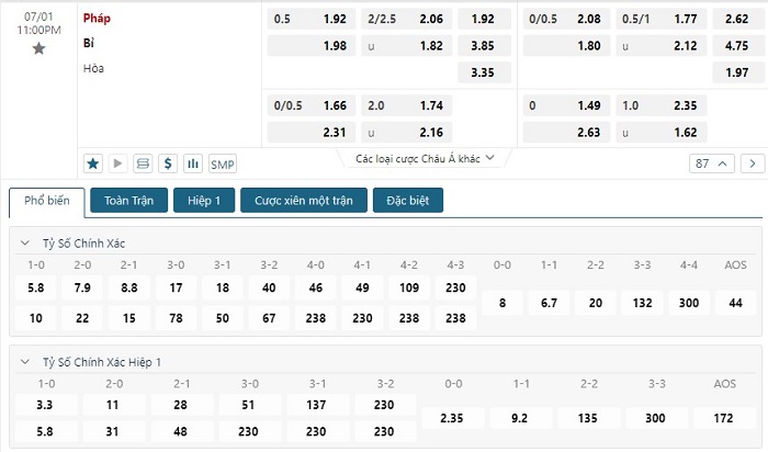Bảng tỷ lệ kèo bóng đá trận đấu Pháp vs Bỉ