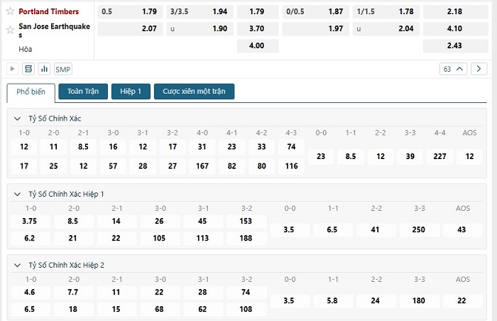 Bảng tỷ lệ kèo bóng đá trận đấu Portland Timbers vs San Jose Earthquakes