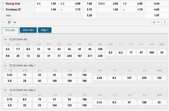 Bảng tỷ lệ kèo bóng đá trận đấu Racing Club vs Fortaleza