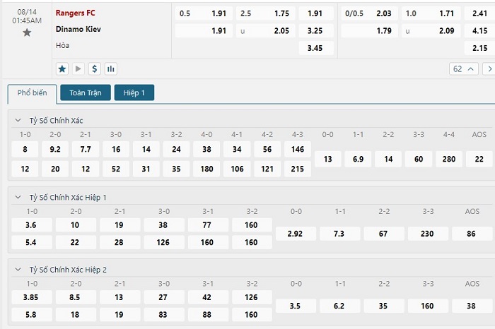 Bảng tỷ lệ kèo bóng đá trận đấu Rangers FC vs Dinamo Kiev