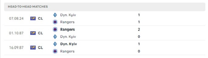 Thành tích quá khứ của hai đội cũng được đánh giá khá cân bằng khi mỗi bên đều có 1 thắng lợi theo mốc kèo châu Âu trong 3 lần gặp nhau, đáng kể là những chiến thắng mà Rangers FC và Dinamo Kiev tạo ra được đều là những chiến thắng trên sân nhà của họ ở những lần gặp nhau trước. Do đó mà có thể đặt niềm tin vào Rangers FC theo mốc kèo châu Âu của trận đấu sắp tới giữa hai đội.