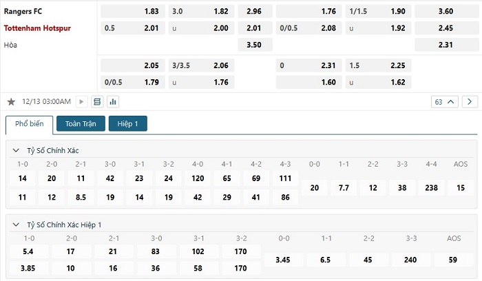 Soi kèo châu Á, kèo chấp Rangers vs Tottenham