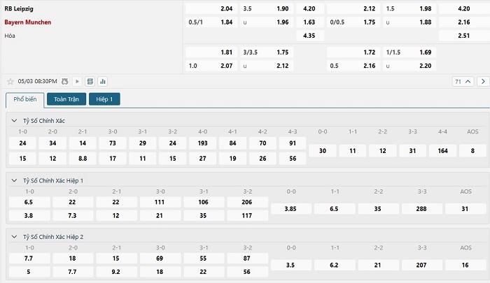 Bảng tỷ lệ kèo bóng đá trận đấu RB Leipzig vs Bayern Munich