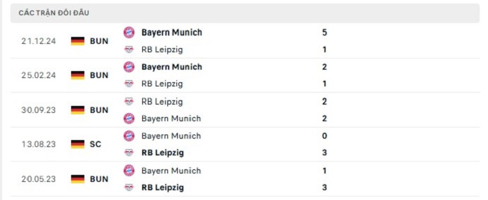 Phong độ gần đây RB Leipzig vs Bayern Munich
