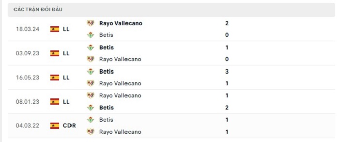 Bảng bóng đá trận đấu Real Betis vs Rayo Vallecano