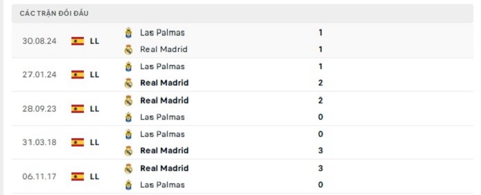 Lịch sử đối đầu của Real Madrid vs Las Palmas