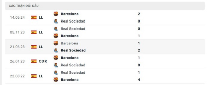 Lịch sử đối đầu của Real Sociedad vs Barcelona