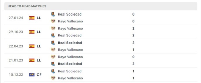 Lịch sử đối đầu của Real Sociedad vs Rayo Vallecano