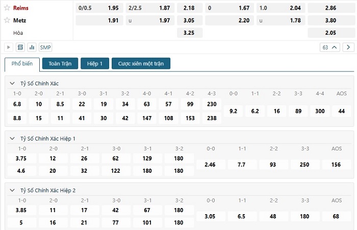 Bảng tỷ lệ kèo bóng đá trận đấu Reims vs Metz
