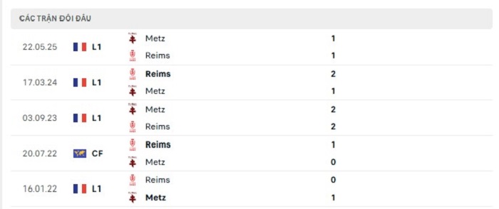 Lịch sử đối đầu của Reims vs Metz