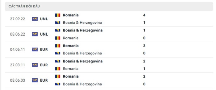 Thành tích trong quá khứ với Romania họ cũng có được những thành công đáng kể trước Bosnia & Herzegovina ở nhiều năm qua, cụ thể là đội bóng áo vàng thắng 4 và chỉ thua 2 trước đối thủ này. Trên sân nhà của mình trong 3 lần tiếp đón Bosnia & Herzegovina thì Romania toàn thắng theo mốc kèo châu Âu được niêm yết có thể thấy được điểm mạnh sân nhà của họ trước đối thủ, do vậy mà có thể kỳ vọng vào việc Romania có thêm một chiến thắng theo kèo châu Âu ở lần ra sân sắp tới.
